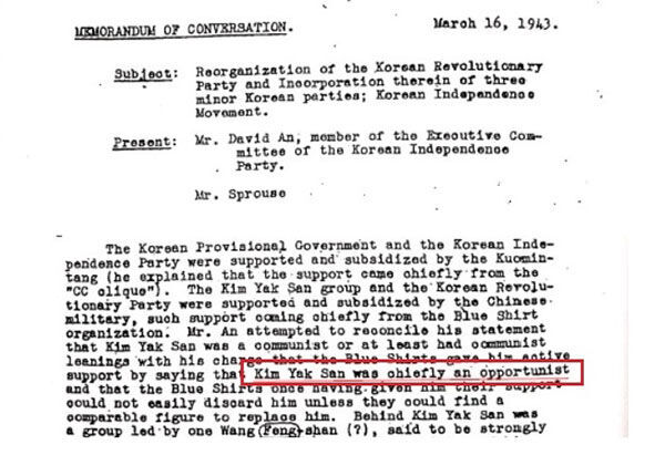 ▲ 안원생과 미국대사관 서기관의 대화록 일부. 안원생이 김원봉에 대해 "기회주의자"라고 말한 것으로 돼 있다. (출처=베이징대 한반도연구소)