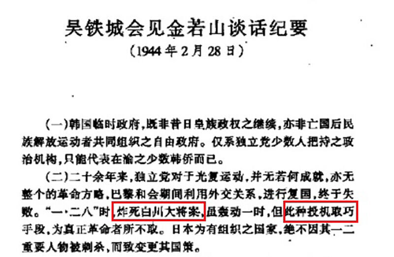 김원봉과 오철성의 대화 기록. 김원봉이 '시라카와 대장 폭사 사건', 즉 윤봉길 의사의 의거를 언급하며 "교묘한 수단으로 이익을 취하는 행동"이라고 말한 것으로 돼 있다. (출처=베이징대 한반도연구소)
